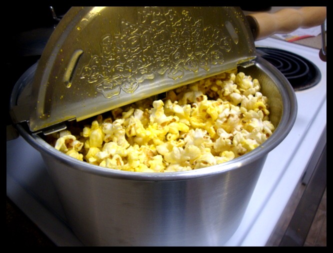 We also received our Whirley Pop from my Uncle & Auntie today! Over Thanksgiving, while chatting over food likes, dislikes, preferences, etc.. popcorn was brought up. My uncle graciously said he would purchase a Whirley Pop for us! Just... WOW! WE LOVE THAT THING! What a simple little invention, that is so fun & easy to use. It came in a huge box, which KK sat on her lap all the way to Grandma's house.. then all the way to the store, and finally.. hours later mind you.. home. She refused help to carry the box inside, hauled it in, and opened to find the box perfectly wrapped with green ribbons. This evening we made popcorn for snack, Xander was too scared to turn the handle for fear of getting oil somehow spilled on him from the covered pan.. but KK stepped up and had no fear {earlier this week she had shown me with pride, her [very] small little scars from cooking incidents}. They thoroughly enjoyed the Whirley Pop!